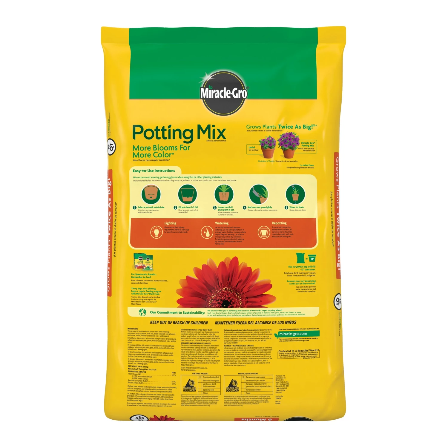 Your plants want to show off. Give indoor and outdoor container plants the right ingredients to grow bigger and more beautiful with Miracle-Gro Potting Mix. Our specially formulated mix feeds for up to 6 months for more blooms and more color. Use with indoor and outdoor container plants. Grows Plants Twice as Big! (vs. unfed plants)